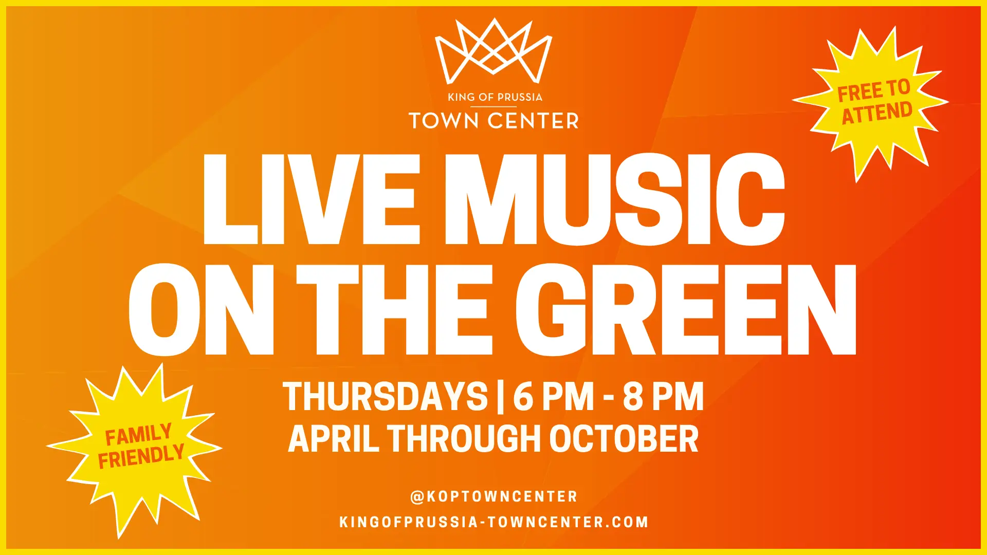 Live music is back at King of Prussia Town Center! Join us on the Green every week from 6–8 PM for a lively, family-friendly atmosphere. This free series features local bands and is just steps away from the Town Center’s great dining options.